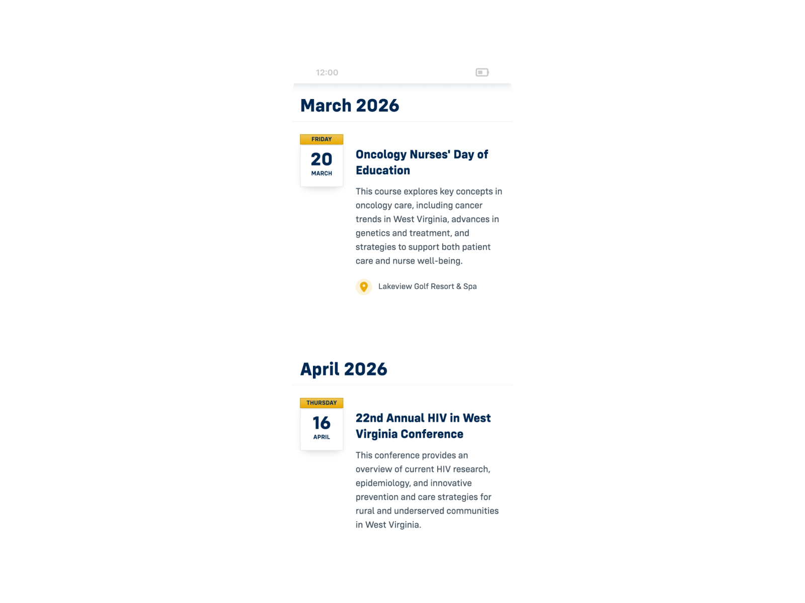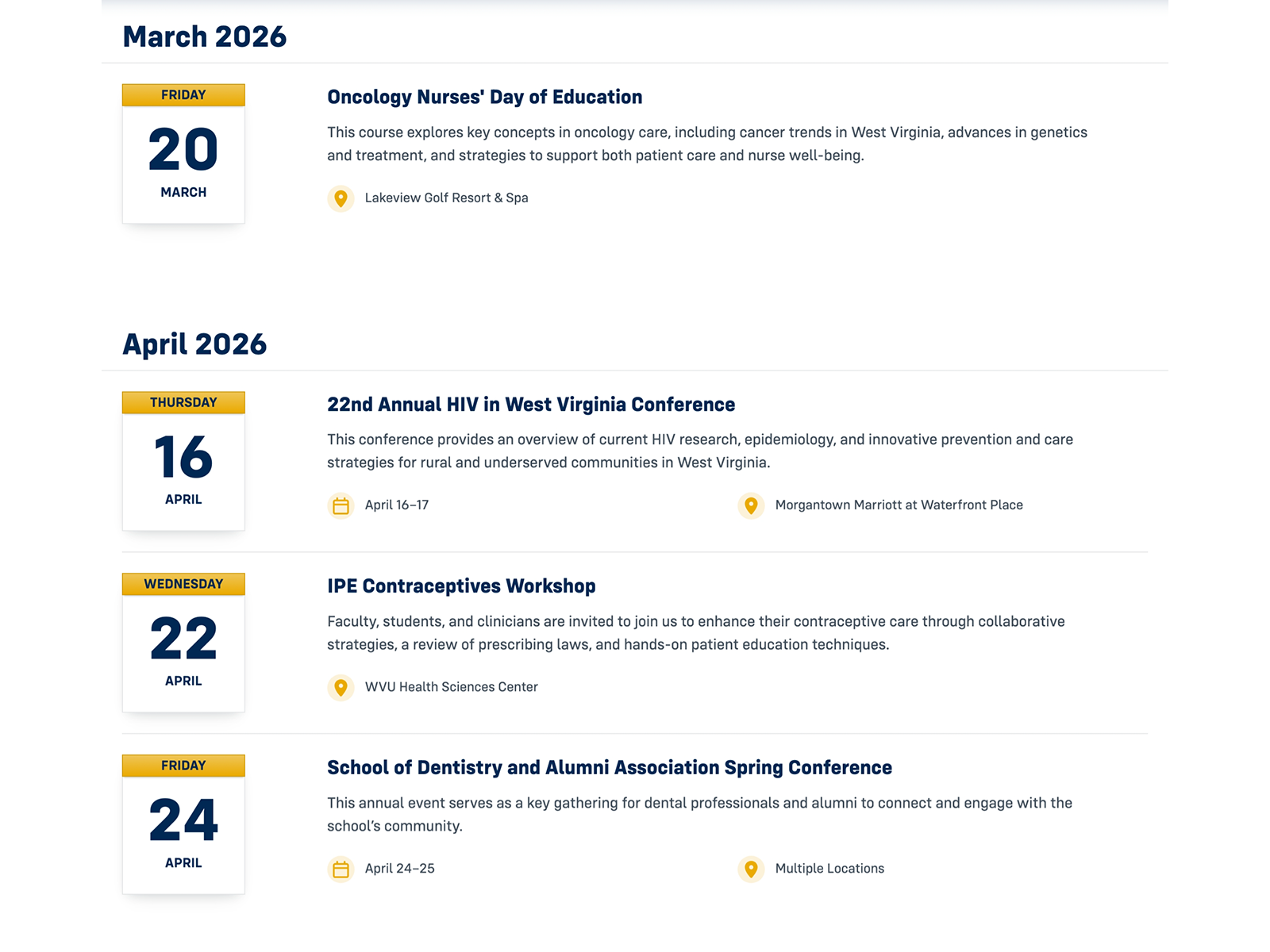Part of the WVU Health design system, an engaging, scalable, and responsive approach to displaying event information covers both a browsable listing and individual detail pages, each requiring close attention to hierarchy, scannability, and brand consistency across desktop and mobile.