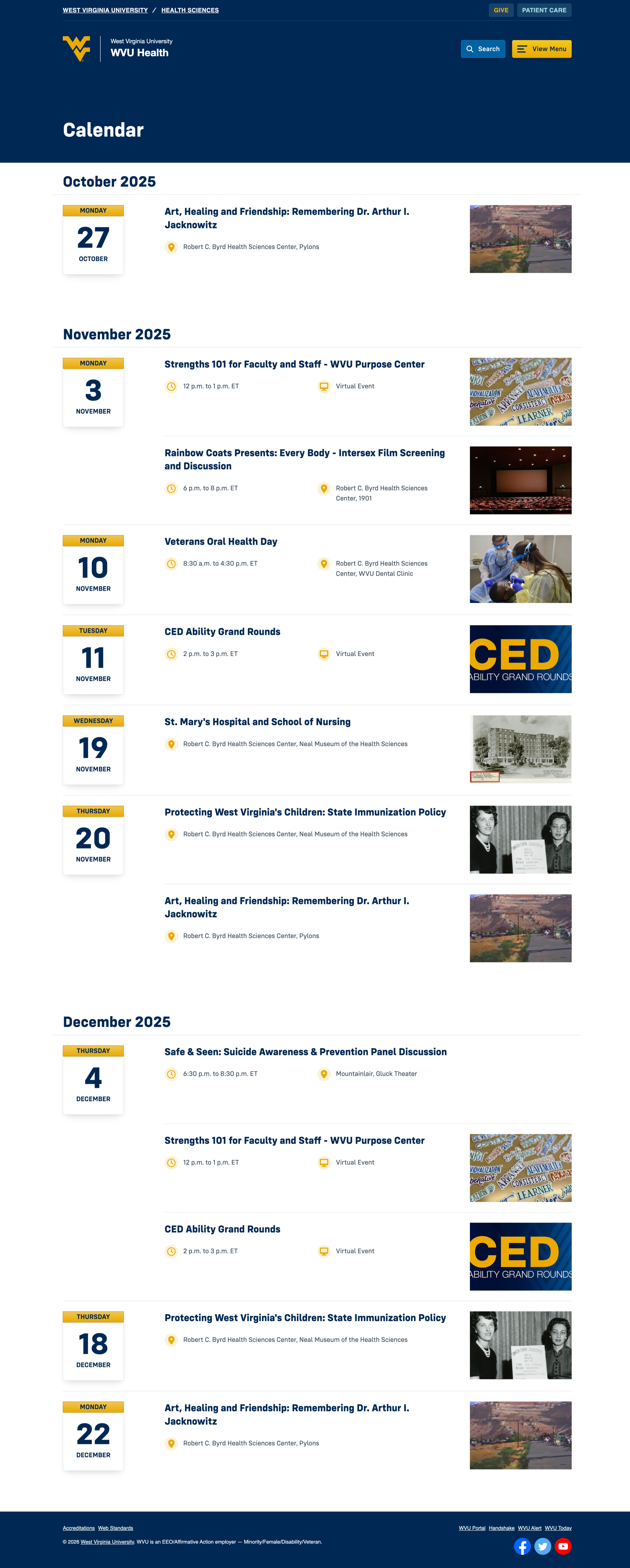 Part of the WVU Health design system, this modern, engaging, and responsive approach to displaying calendar events for WVU Health Sciences is designed to pull real-time data from the university’s Localist API.
